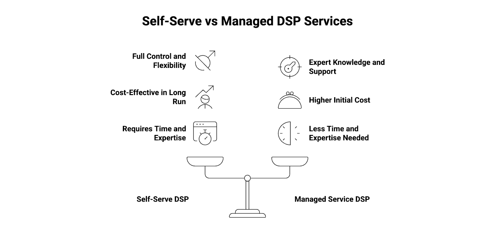 Self-serve works best if you have an experienced marketing team that understands programmatic buying and optimization. It can save money in the long run since you are not paying extra for outside management. The trade-off is that it takes time, skill, and attention to run campaigns well.
