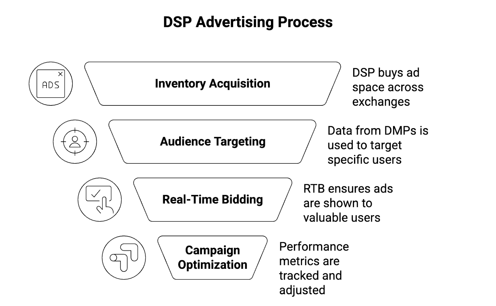 A DSP is important in digital advertising because it automates how ads are purchased and delivered. Here’s what it does: