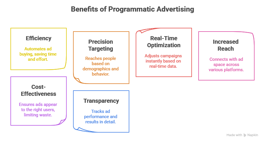 - It offers key benefits including efficiency, precise targeting, real-time optimization, wide reach, cost-effectiveness, and transparency compared to traditional media buying.