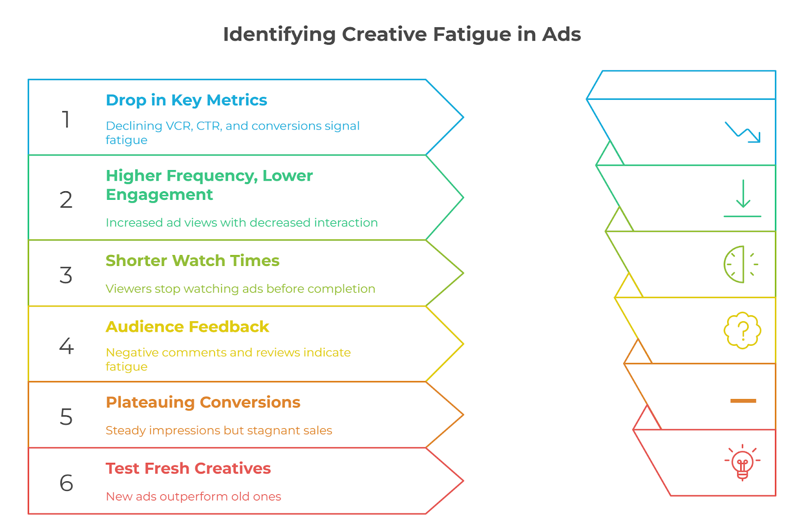 - Early detection is crucial and can be spotted through specific warning signs. Watch for declining metrics like CTR and VCR, increasing frequency with falling engagement, shorter watch times, plateauing conversions despite steady spend, and audience feedback indicating overexposure.