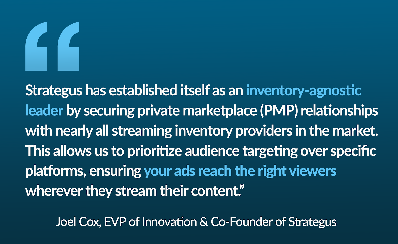 But to gain access to a PMP, advertisers need to establish relationships with publishers or work with a CTV provider like Strategus with a network of inventory partners.
